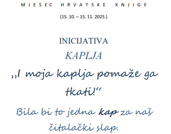 Tijekom Mjeseca hrvatske knjige razrednici i učiteljice prikupljali su novac učenika te su ga po završetku inicijative predali predstavniku Vijeća roditelja svog razreda. Prikupljenim novcem pribavljena su četiri kompleta lektirnih naslova (2 za razrednu i 2 za predmetnu nastavu) i nekoliko aktualnih, pojedinačnih književnih djela.