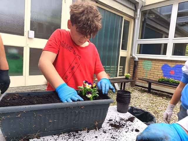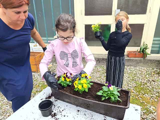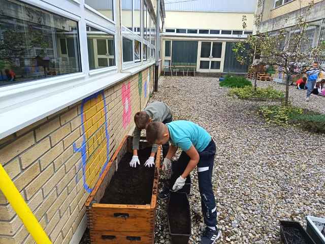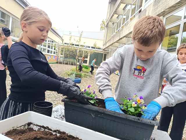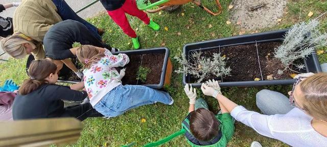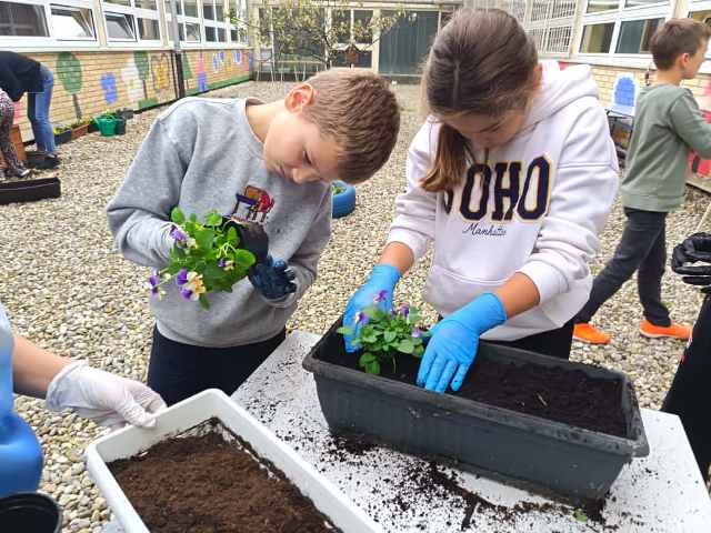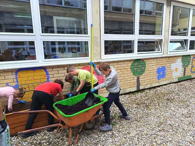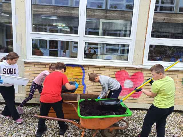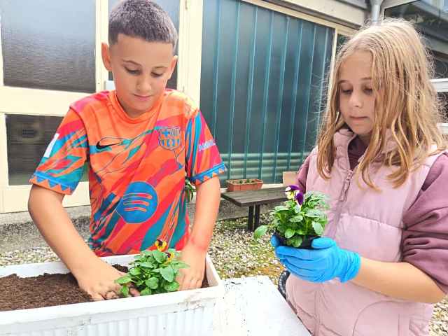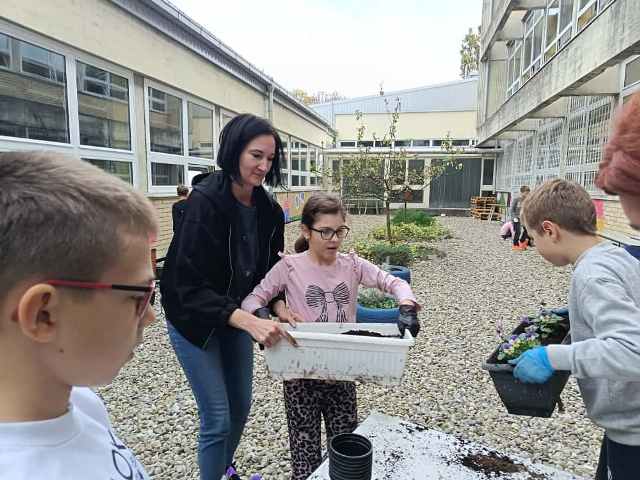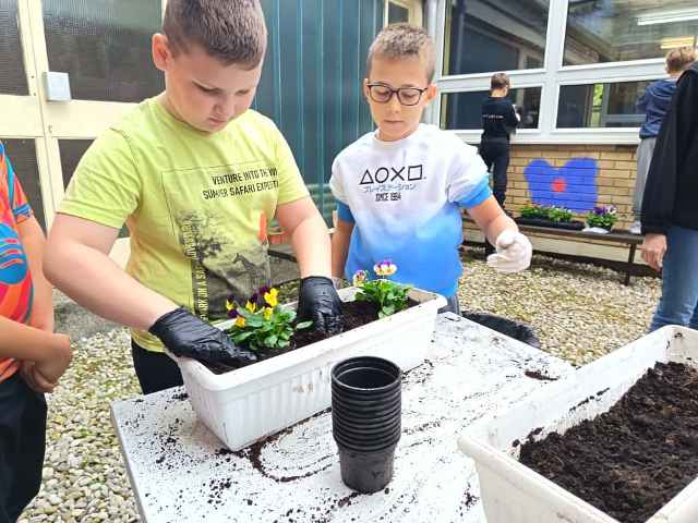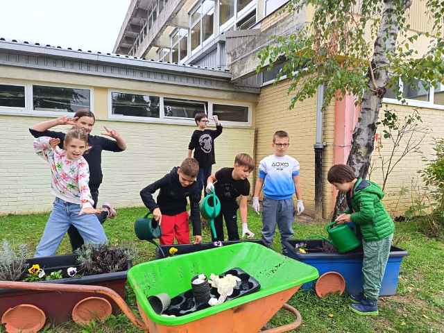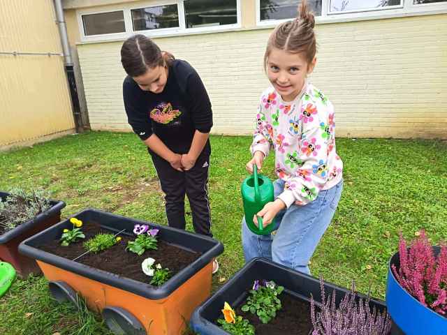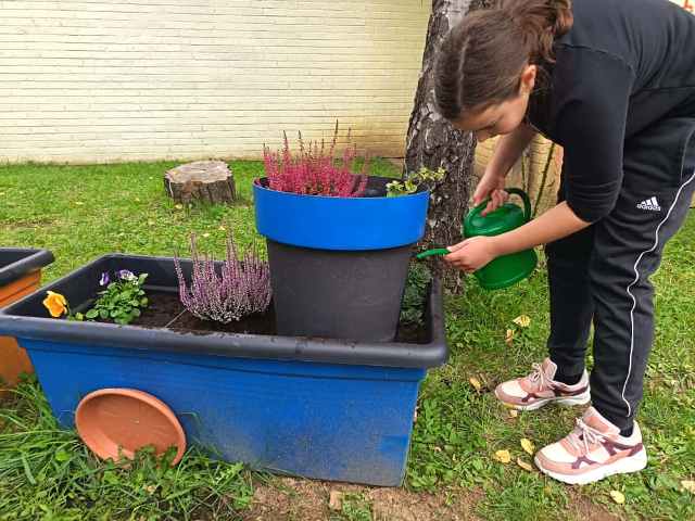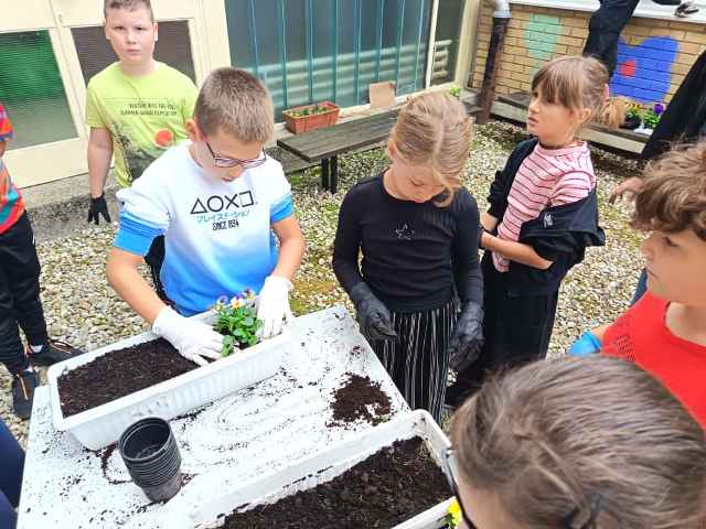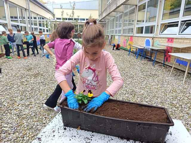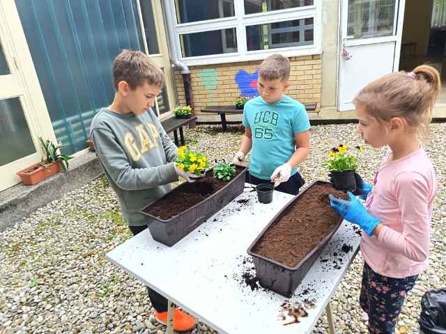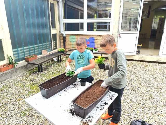 Tako su u četvrtak, 9. listopada, zajedno s učenicima posebnih razrednih odjela posadili vrijesak i maćuhice. Uz pomoć učiteljica i pomoćnica u nastavi, ponovili su školsko gradivo iz prirode i društva i uvježbali vrtlarske vještine.