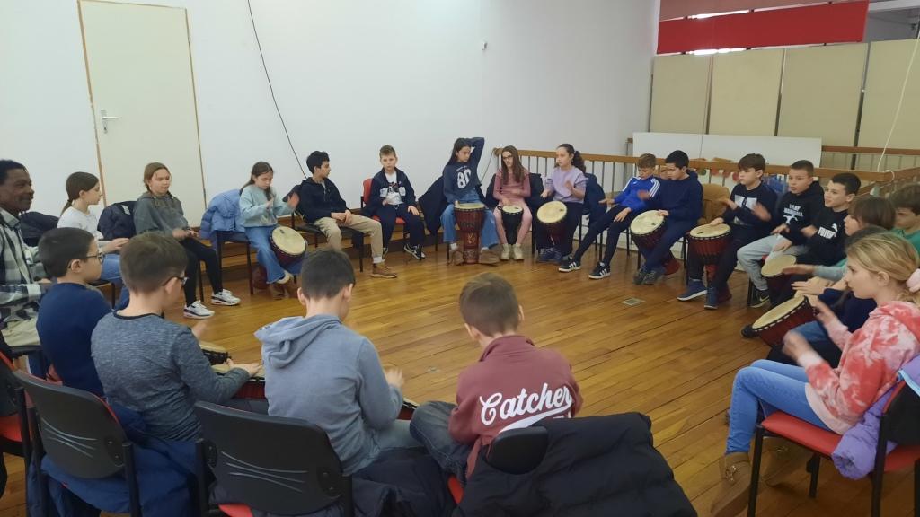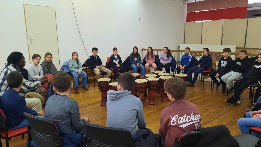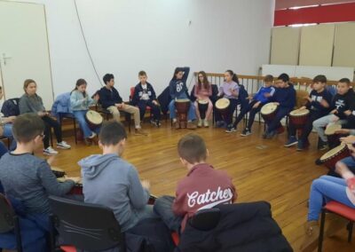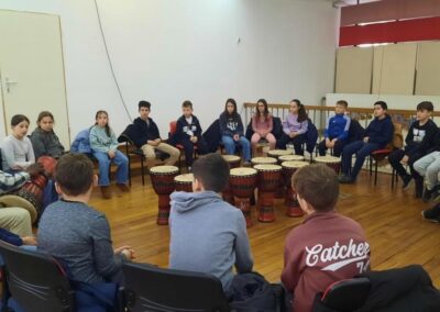 Nakon razgledavanja izložbe slijedila je glazbena radionica: Ritmovi Afrike – djembe bubnjevi. Na radionici učenici su naučili kako se sviraju djembe i to im se jako svidjelo.