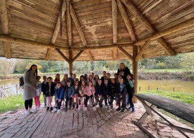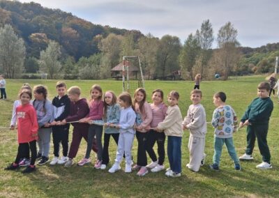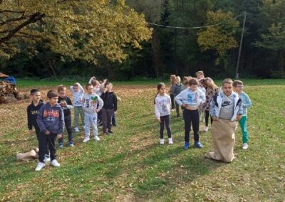 Nakon vrijednog rada uslijedile su vesele igre i natjecanja, skakanje u vreći i povlačenje užeta. Posebno ih je razveselilo hranjenje ribica u jezeru i prelazak preko drvenog mostića koji vodi do njega.